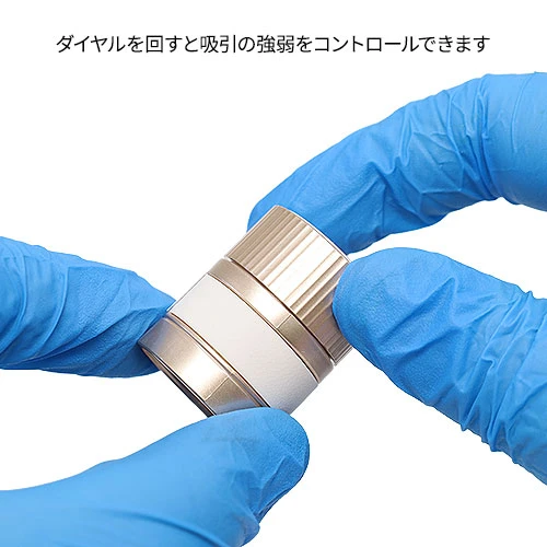 キャップのようなパーツはリモコンです。ダイヤルを時計回りに回すと吸引が強くなり、反時計回りに回すと吸引が弱くなります。また、先端のボタンを2秒以上長押しすると押している間は爆発モードが起動します。