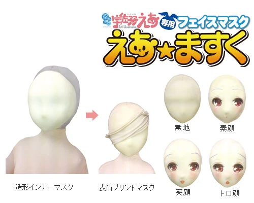 宇佐羽えあ専用タイツ「えあますく」 (別売品) (無地、素顔、笑顔、トロ顔)の4タイプがあります。 造形インナーマスクと表情プリントマスクのセットです。 造形インナーマスクをかぶせて、表情マスクを上に被せます。