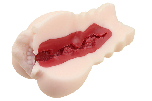 こちらのオナホールは二重構造を採用。粘膜カラーのワインレッドがそそります。